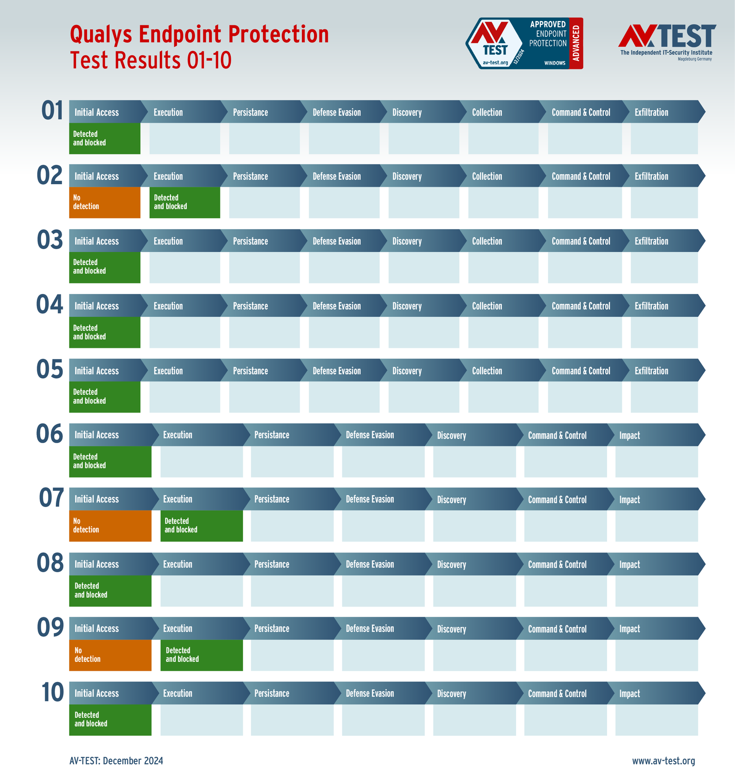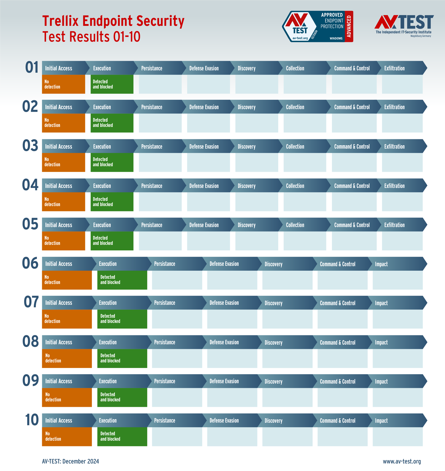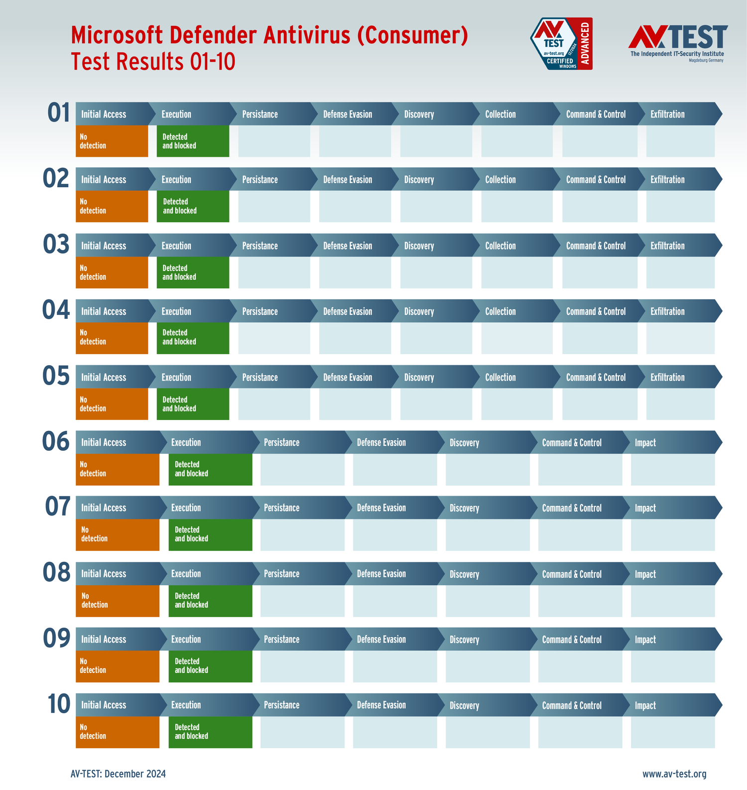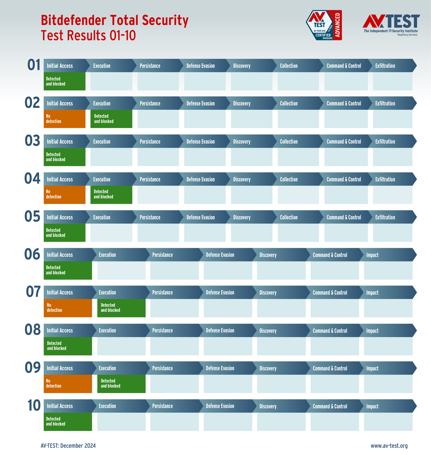 Все антивирусы должны были успешно защитить систему от 5 вариантов программ-вымогателей и 5 образцов ПО для кражи данных в 10 реальных сценариях. Каждый сценарий атаки описан в матрице в соответствии со стандартом MITRE ATT&CK. Определены все отдельные этапы атаки, а также задокументированы защитные реакции. Таким образом, вредоносное ПО может быть обнаружено сразу или остановлено на более поздних этапах защиты.