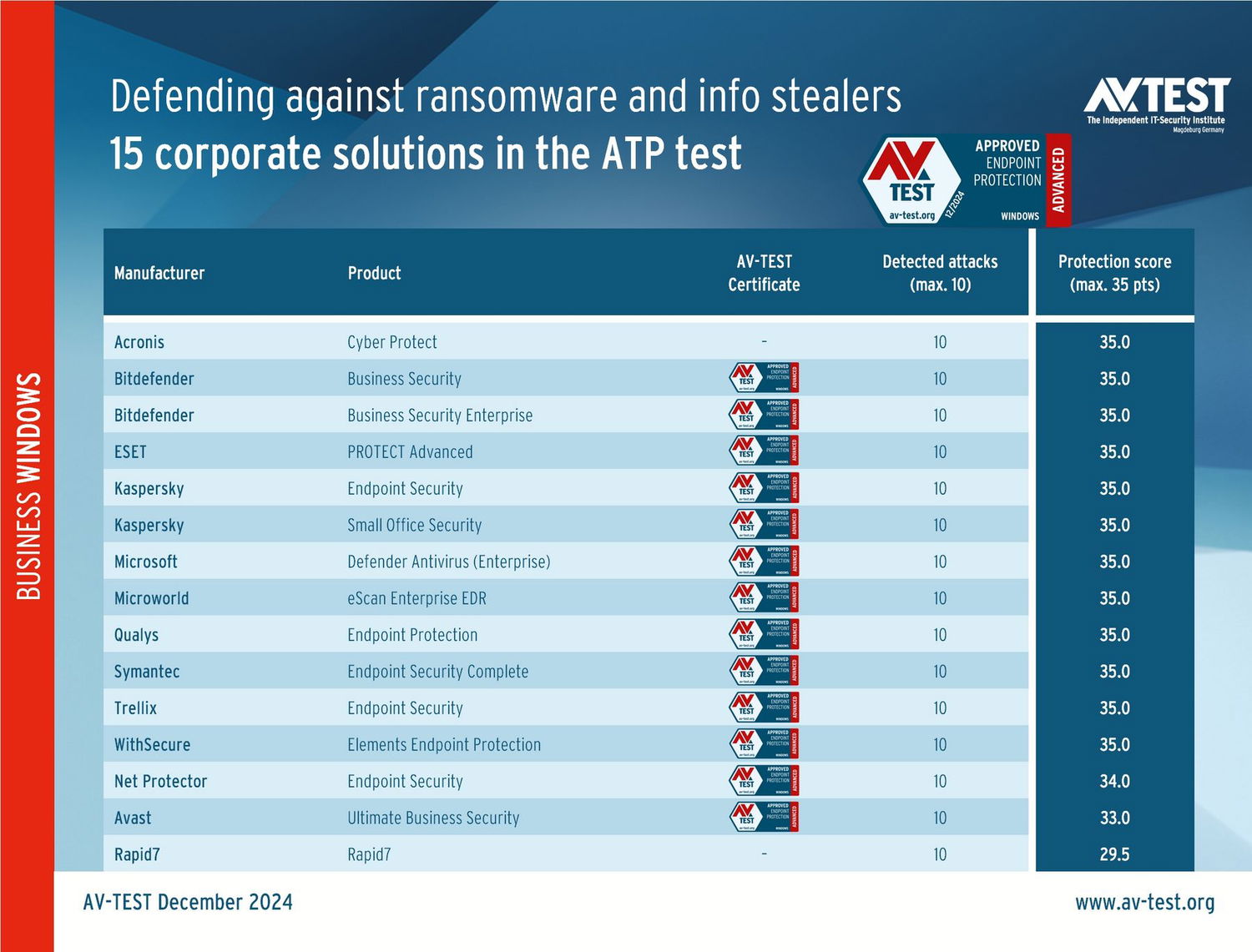 ATP-тест наглядно демонстрирует, насколько эффективно защитные решения под управлением Windows обеспечивают безопасность систем. При оценке AV-Test использует актуальные образцы вредоносного ПО из категорий программ-вымогателей и инфостилеров, проводя атаки с применением современных стратегий и методов. Некоторые антивиурсы угрозам удалось обойти, а другие успешно отразили все атаки без исключения.