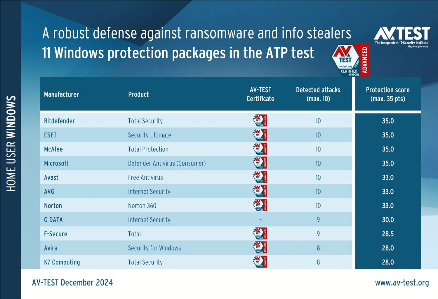 Avira и K7 Computing обнаружили лишь 8 из 10 атак. При отсутствии защиты против одной программы-вымогателя и одного ПО для кражи данных каждый продукт потерял полный набор баллов (4 и 3 балла соответственно), что привело к итоговому счету в 28 баллов вместо 35.