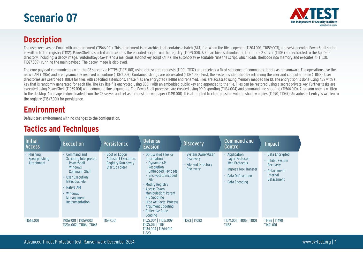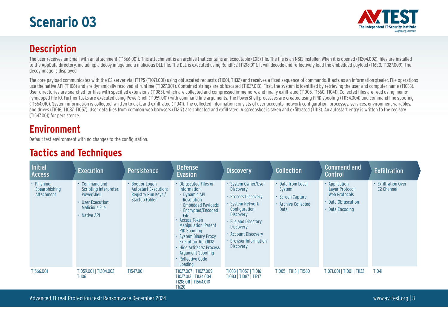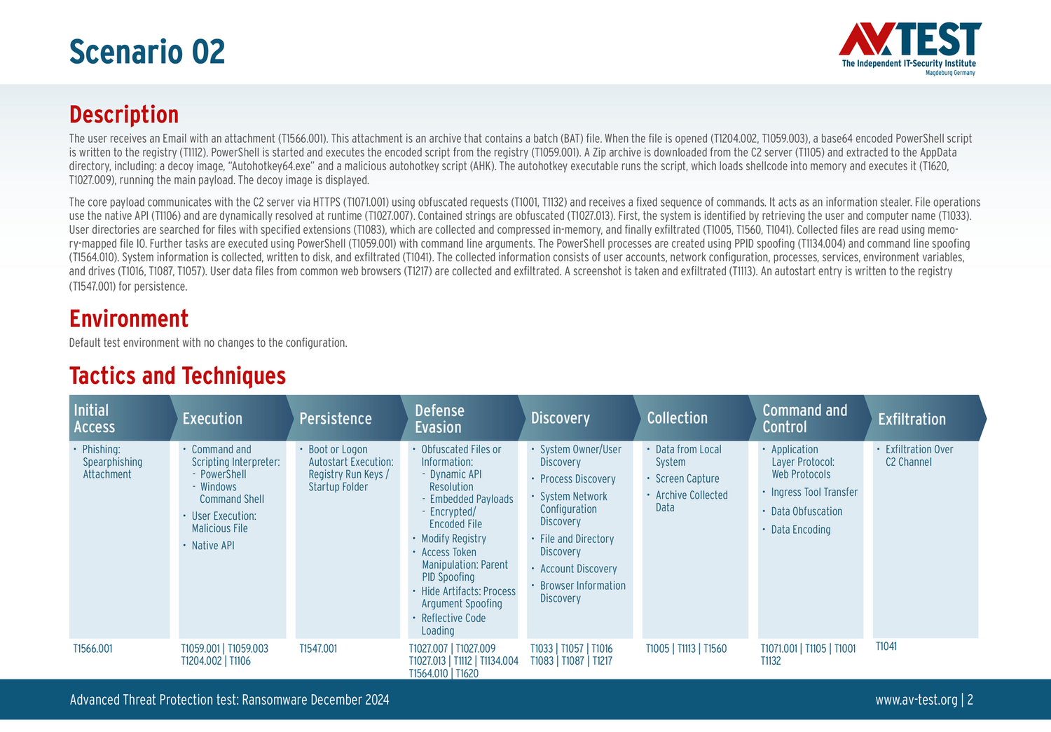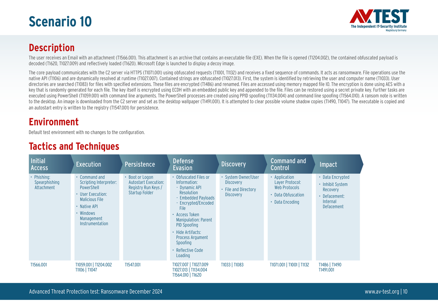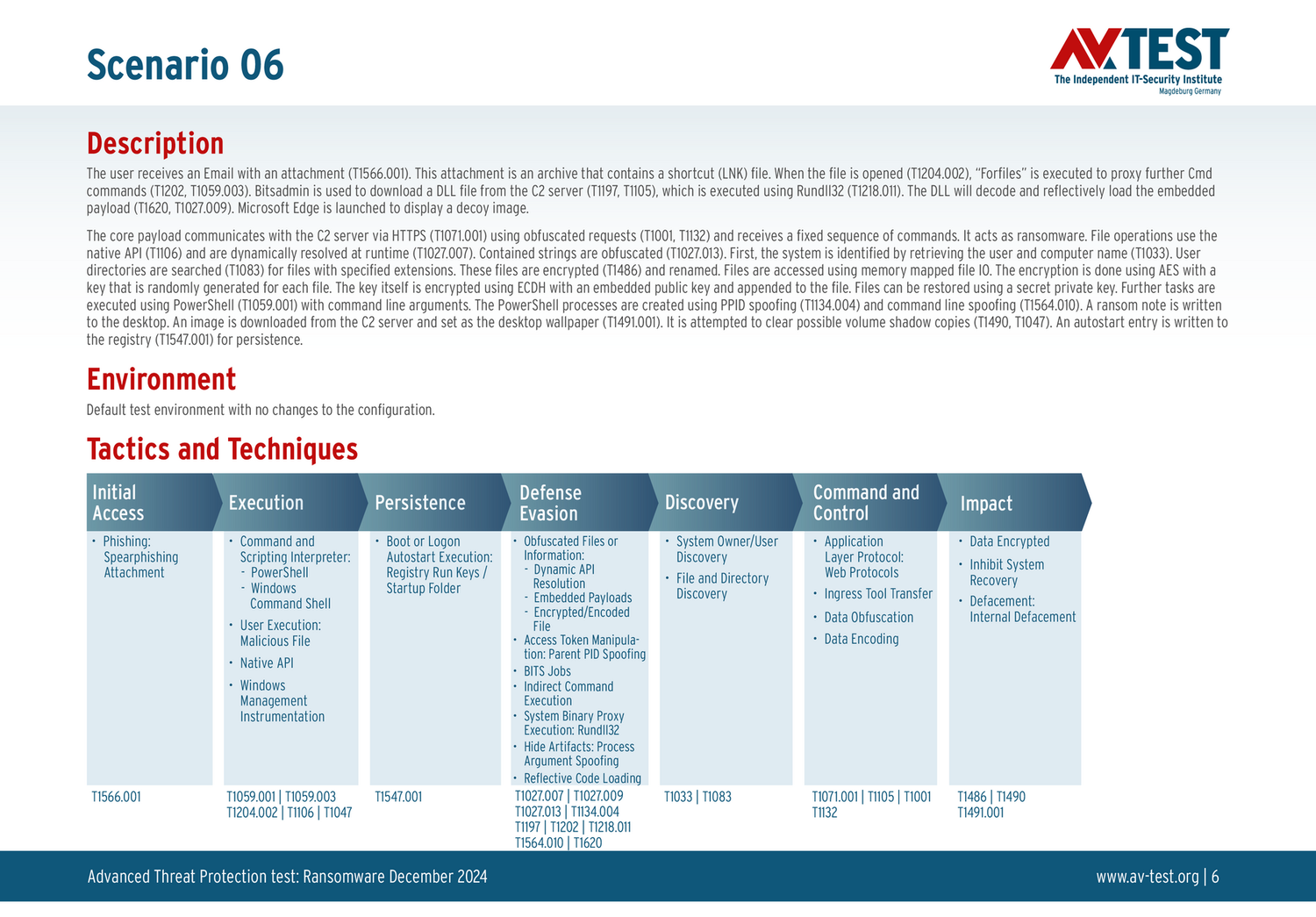 Все сценарии атак задокументированы в соответствии со стандартом базы данных MITRE ATT&CK. Отдельные подметоды, например «T1566.001», перечислены в базе данных MITRE как «Phishing: Spearphishing Attachment». Таким образом, каждый шаг теста идентифицируется среди экспертов и его можно понять логически.