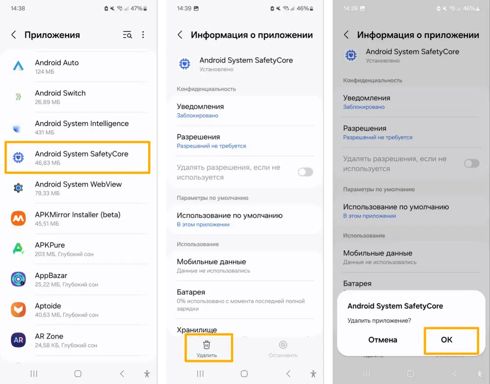 Как удалить Android System SafetyCore