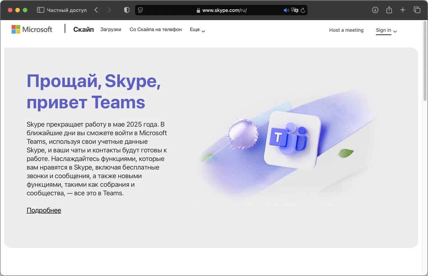 «Чтобы упростить наши бесплатные сервисы для общения и быстрее адаптироваться к потребностям пользователей, мы прекращаем поддержку Skype в мае 2025 года и сосредоточимся на Microsoft Teams (бесплатная версия) – нашем современном центре для связи и совместной работы.»