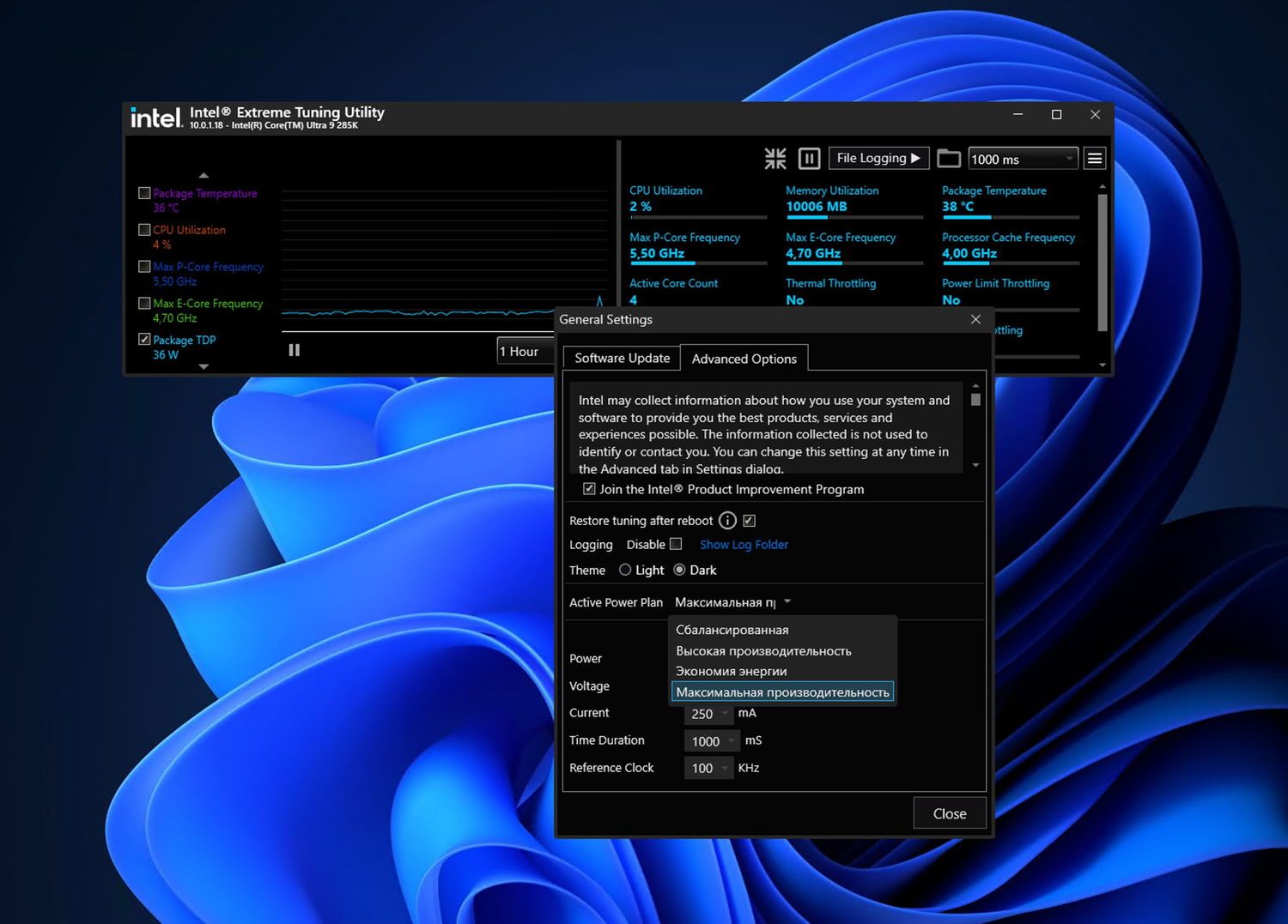 Пользователь утверждает, что производительность в тесте 7Zip фактически уменьшалась вдвое при сворачивании программы, а распределение нагрузки между всеми 24 ядрами процессора Intel Core Ultra 9 285K не решало проблему. Пока окончательного решения не найдено, единственным обходным вариантом остается принудительное использование режима электропитания «Максимальная производительность». Это позволяет обеспечить «полную производительность процессора» для фоновых процессов, но далеко от идеального варианта для длительного использования.
