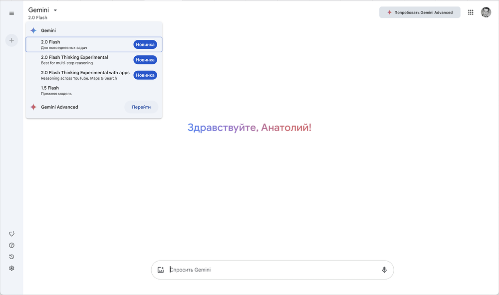 - Выберите модель Gemini > 2.0 Flash Experimental или 2.0 Pro Experimental (если у вас подписка Gemini Advanced).