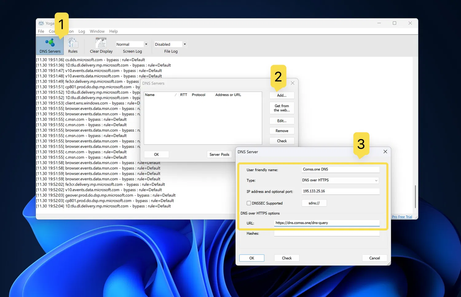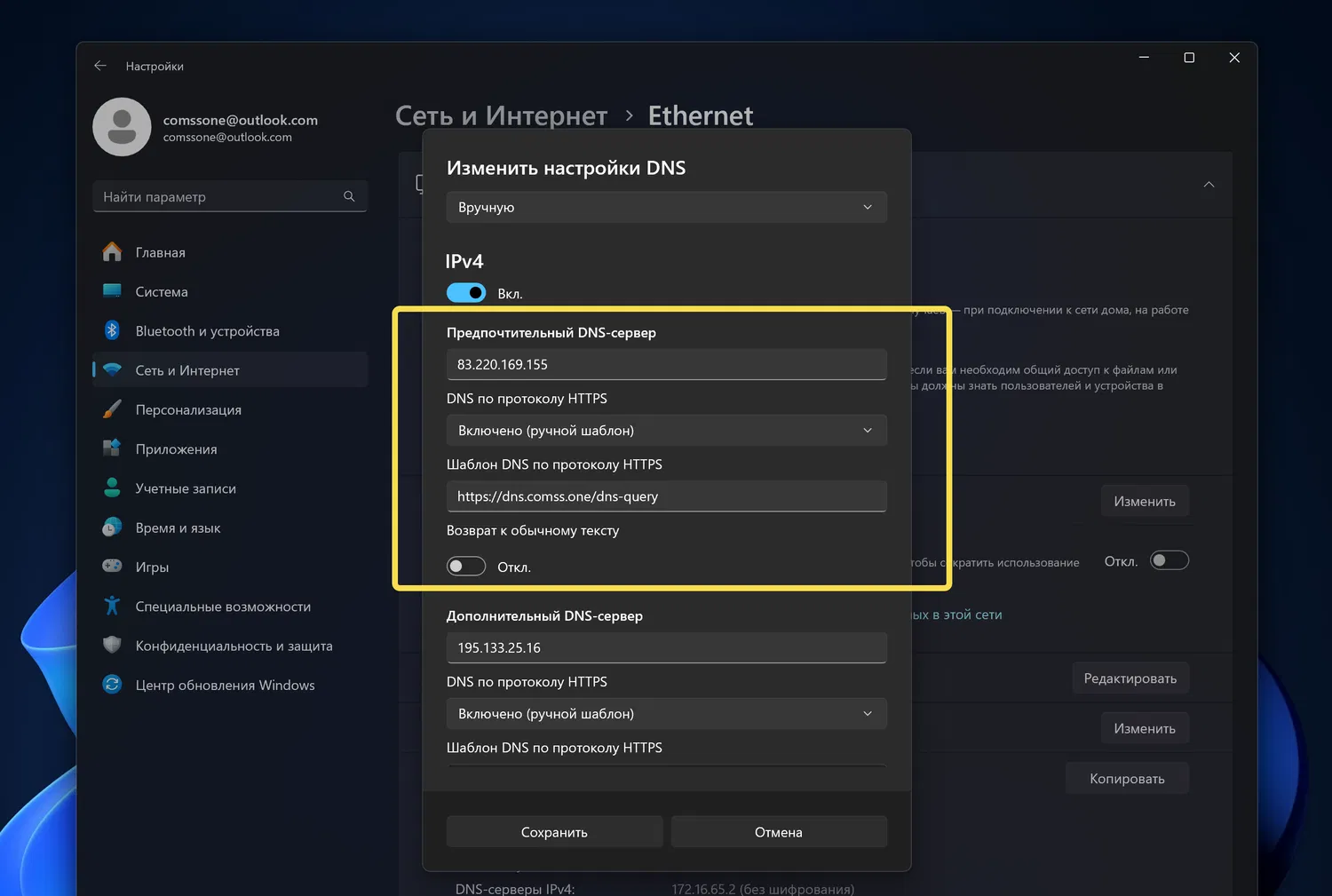 Использование DNS-over-HTTPS сервера Comss.one DNS в Windows 11
