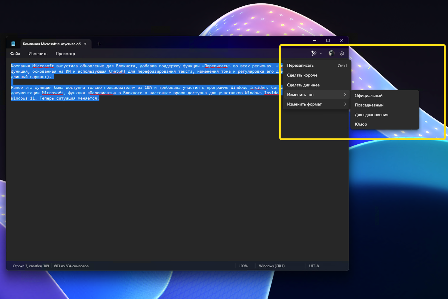 Microsoft утверждает, что функция «Переписать» работает на базе «GPT». Это, вероятно, означает использование одной из моделей ChatGPT, адаптированной под нужды обычного пользователя Блокнота. Скорее всего, эта модель отличается от доступной на chat.openai.com.