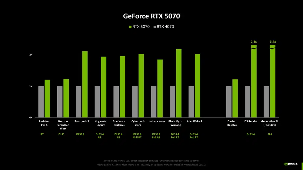По данным NVIDIA, RTX 5070 демонстрирует прирост производительности на 20% в режиме трассировки лучей без DLSS по сравнению с RTX 4070. Однако без технологии Multi-Frame Generation карта уступает RTX 4090 в традиционном рендеринге и трассировке лучей.