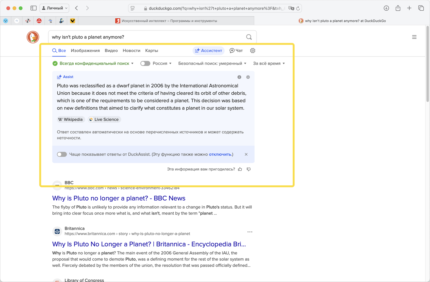 DuckDuckGo впервые запустил ответы с помощью ИИ (DuckAssist) в 2023 году. Эта функция позиционируется как альтернатива ИИ-обзорам Google, разработанная для предоставления более кратких ответов и позволяющая настраивать частоту их отображения, включая полное отключение ответов. Если вы установили для ответов, сгенерированных ИИ DuckDuckGo, значение «часто», вы все равно будете видеть их только около 20 процентов времени, хотя компания планирует в конечном итоге увеличить частоту.