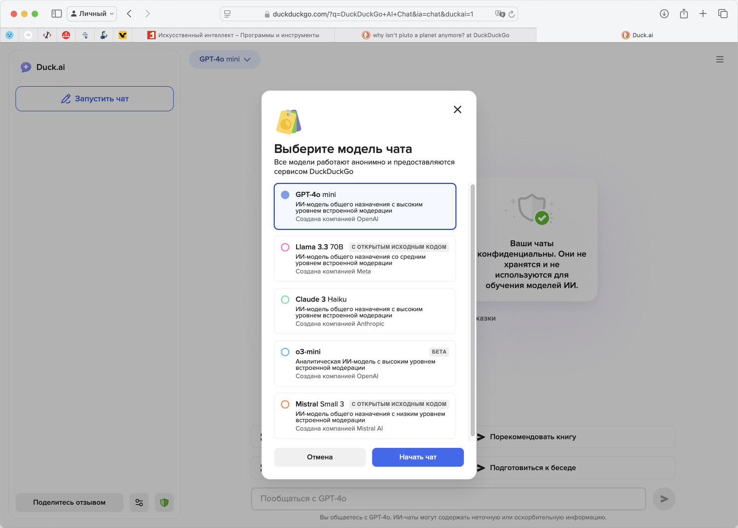Он позволяет вам переключаться между GPT-4o mini, o3-mini, Llama 3.3, Mistral Small 3 и Claude 3 Haiku, причем преимущество заключается в том, что вы можете взаимодействовать с каждой моделью анонимно, скрывая свой IP-адрес. DuckDuckGo имеет соглашения с компаниями, стоящими за каждой моделью, что позволяет гарантировать, что ваши данные не используются для обучения.