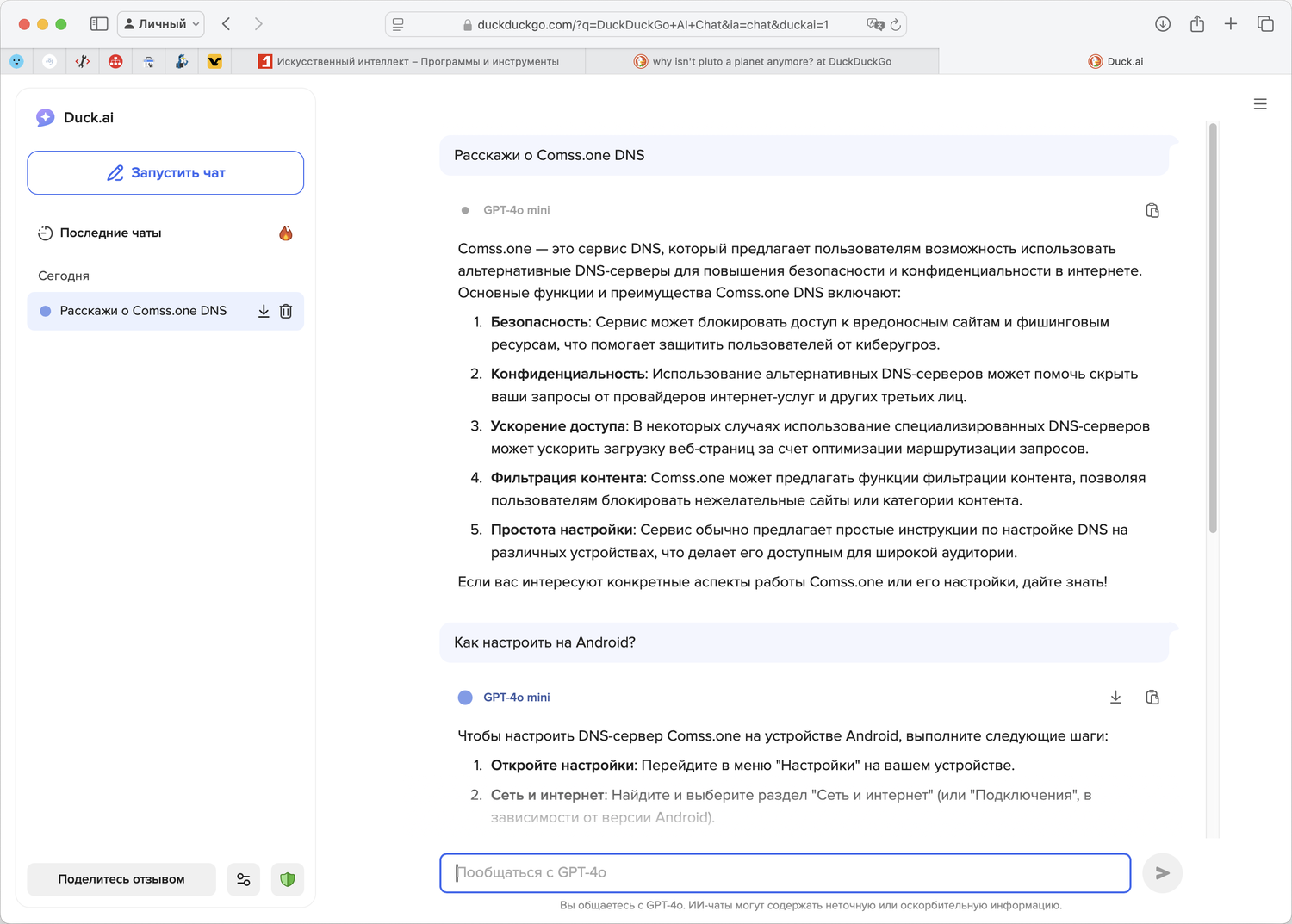 Вы можете попробовать чат-бота DuckDuckGo на сайте Duck.ai или в браузере DuckDuckGo, а также найти ответы, сгенерированные с помощью ИИ, в поисковой системе DuckDuckGo.