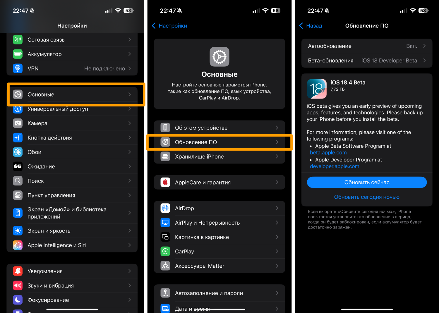 - Вернитесь в «Обновление ПО» и дождитесь появления iOS 18.4 Beta.