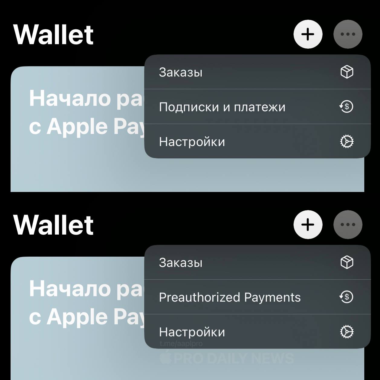 В приложении Wallet раздел "Подписки и платежи" был переименован в "Предавторизованные платежи".