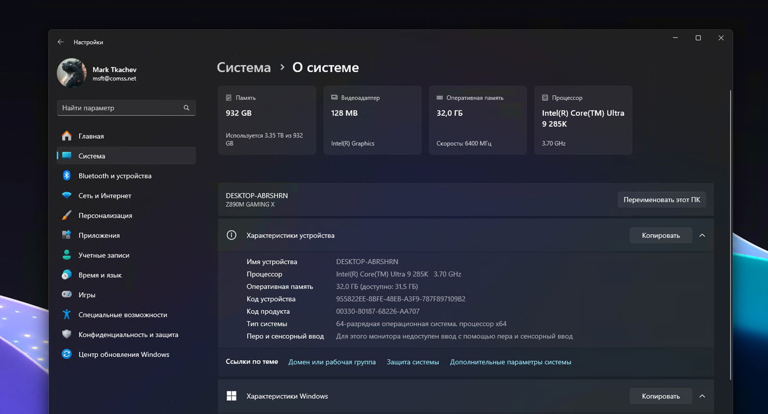 - Новое! В разделе «О системе» теперь отображаются карточки с характеристиками устройства (объем памяти, графика, хранилище и т. д.).
