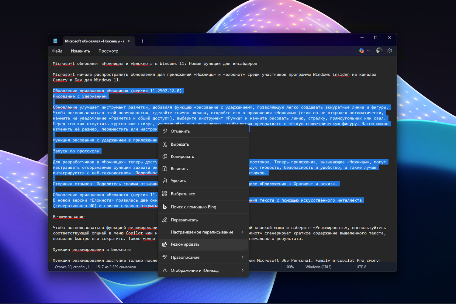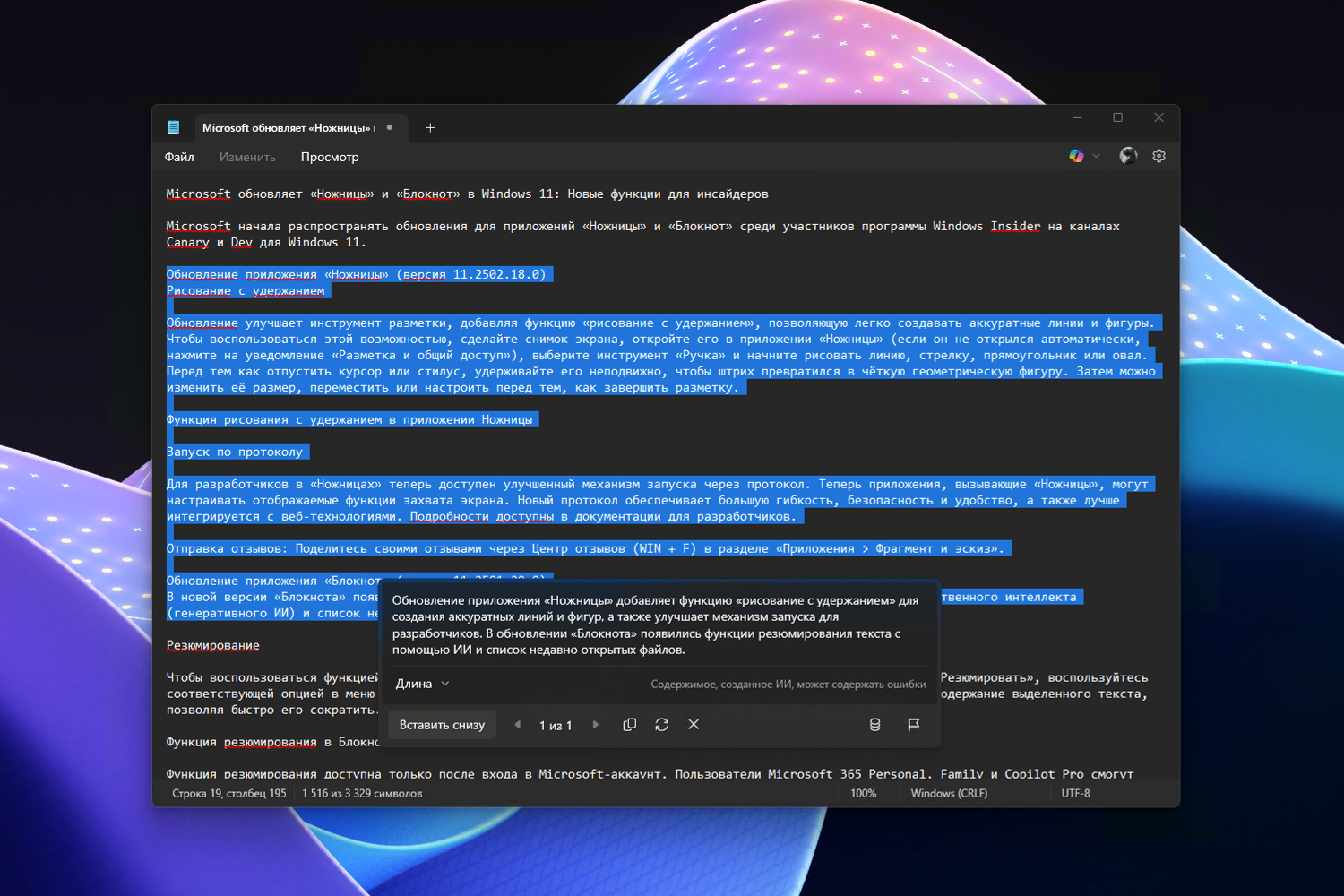 Блокнот с ИИ-функцией «Переписать текст» доступен пользователям Windows 11 с подпиской Microsoft 365