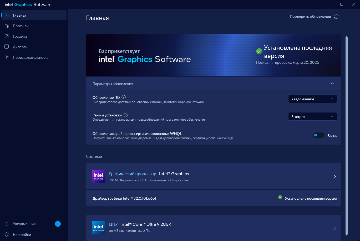 Последнюю версию драйвера также можно установить с помощью приложения Intel Driver & Support Assistant. Запустите утилиту и проверьте наличие последних версий драйверов для продуктов Intel.