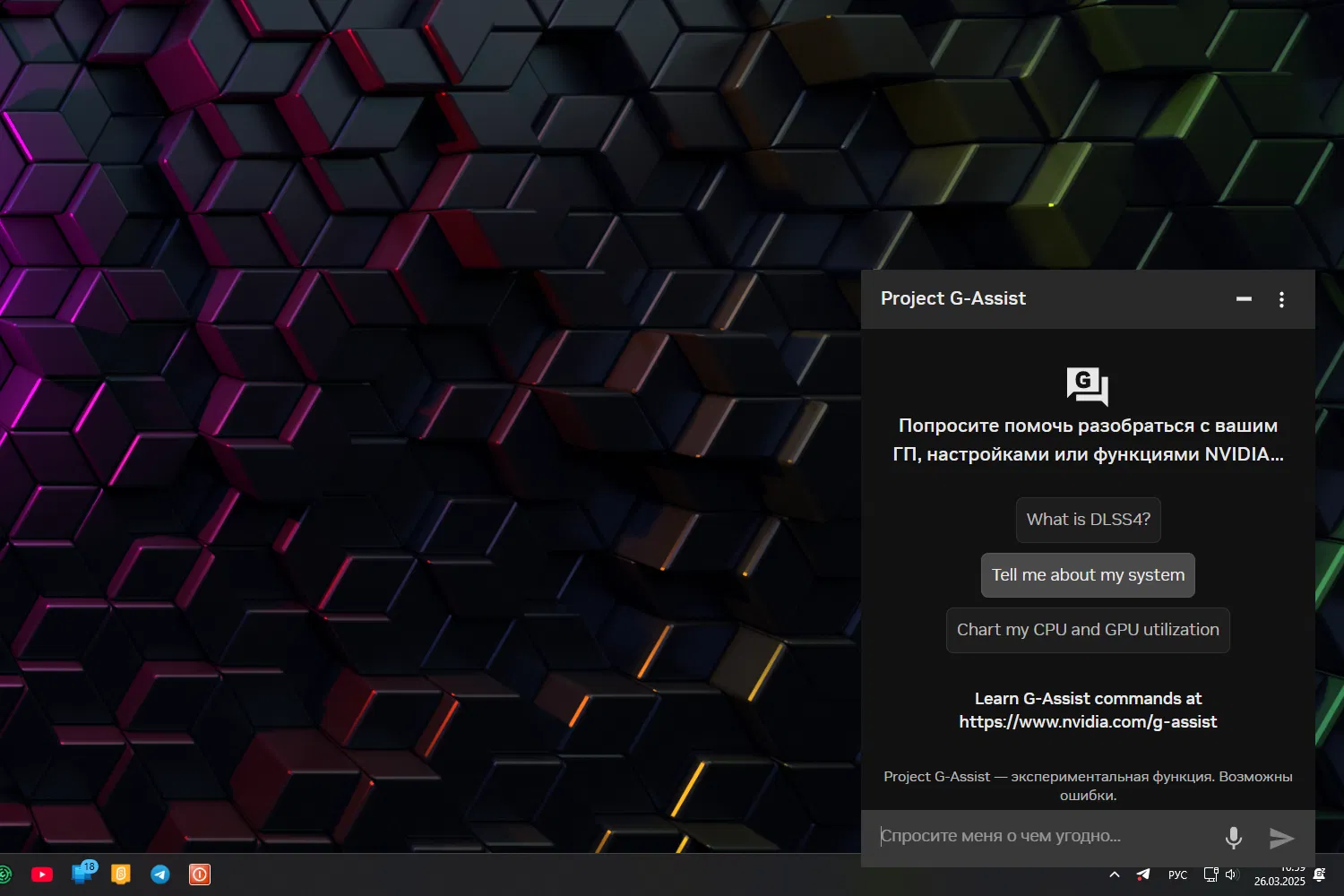 «Какой у меня FPS в текущей игре?», «Снизь энергопотребление на ноутбуке», «Оптимизируй систему под Cyberpunk 2077», «Включи DLSS 3.5» и т. д.
