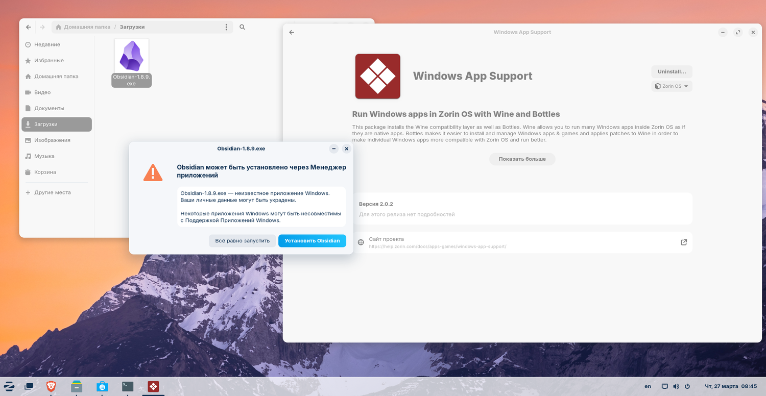 База данных встроенного обнаружения приложений значительно расширена. Теперь система распознает более 150 популярных программ для Windows, предлагая пользователям либо их нативные версии для Linux, либо подходящие аналоги. Например, при запуске установочного файла Obsidian система отображает диалог, направляющий к версии приложения в Центре приложений. Для программ, доступных только на Windows, таких как Adobe Acrobat Reader, предлагается встроенный просмотрщик документов.