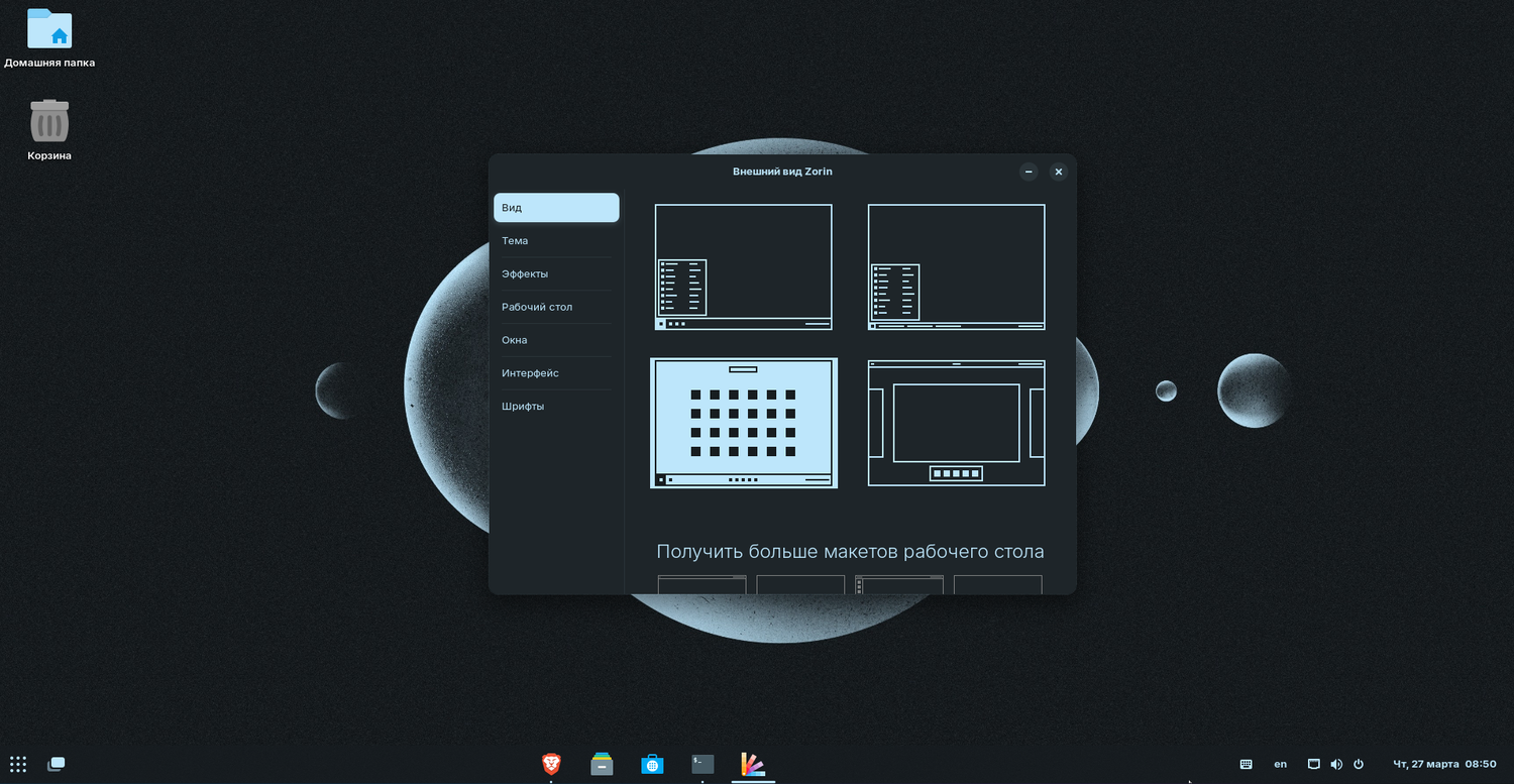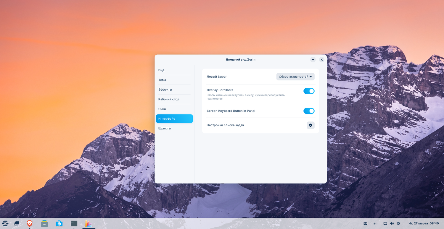 Для устройств с сенсорным управлением добавлены улучшения интерфейса, включая панель задач и раскладку Touch в настройках Zorin Appearance. Экранная клавиатура теперь вызывается вручную через панель — опция доступна в разделе Zorin Appearance - «Интерфейс» настроек.