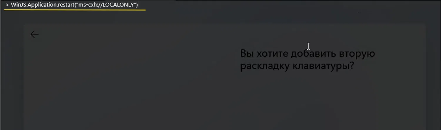 - Команда, используемая кнопкой, WinJS.Application.restart("ms-cxh://LOCALONLY"), принудительно перезапускает OOBE и вызывает простое меню настройки локальной учётной записи.