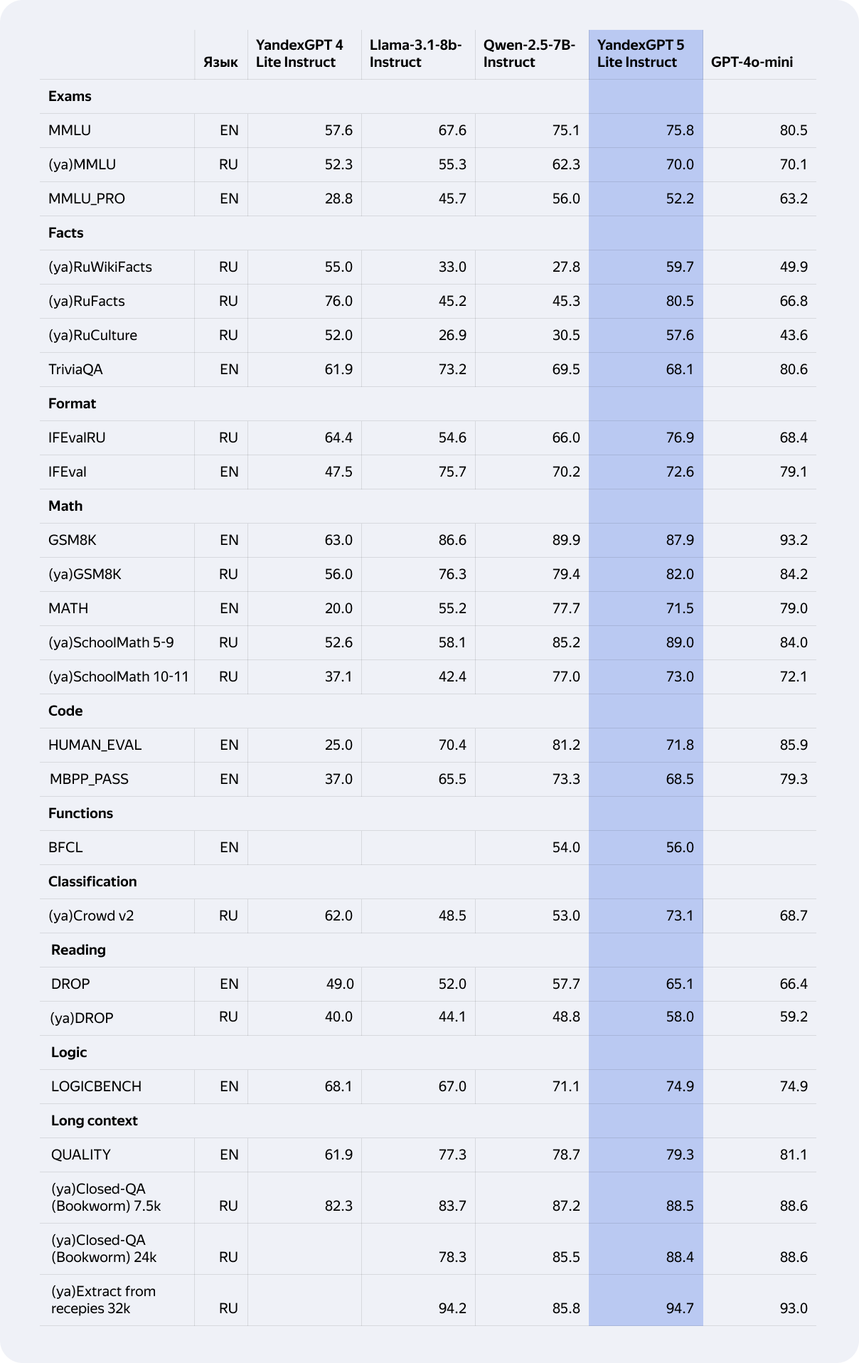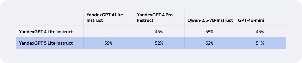 Согласно внутренним тестированиям Яндекса по метрике Side by Side, YandexGPT 5 Lite Instruct в 62% случаев показывает более качественные ответы, чем китайская Qwen2.5-7B-Instruct. А по некоторым задачам сопоставима с GPT-4o Mini — компактной версией флагманской модели OpenAI.