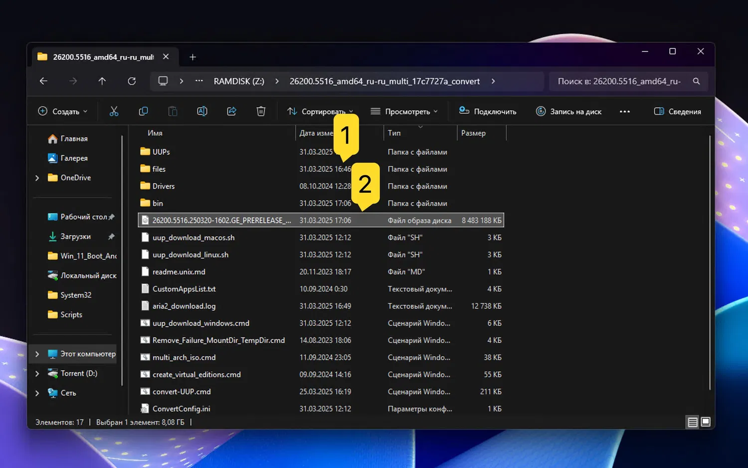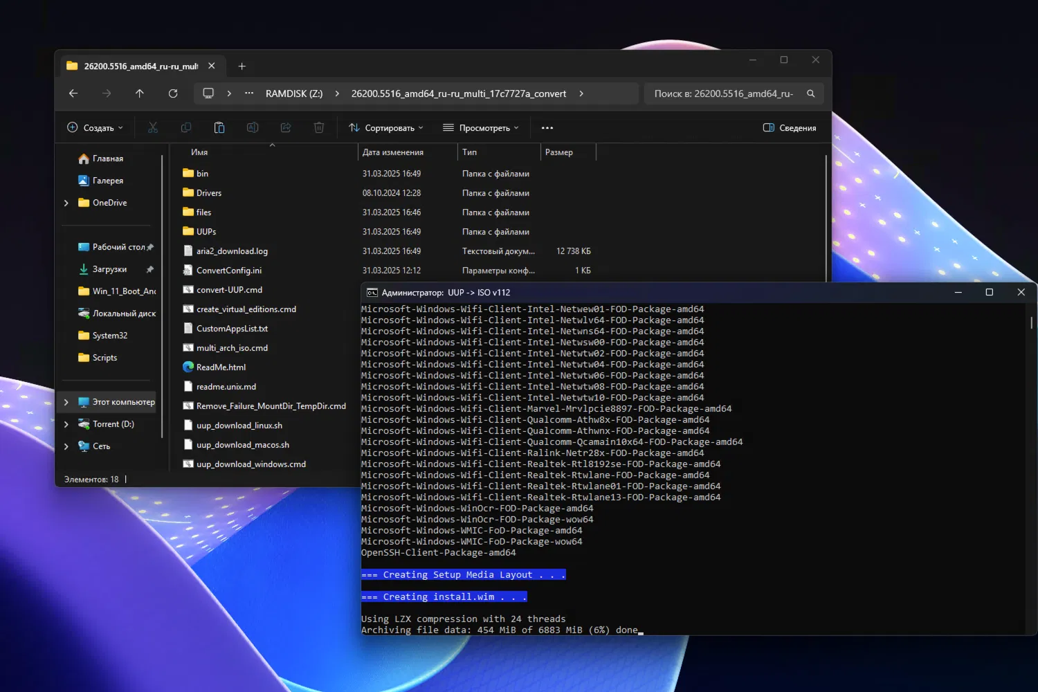 После полного отключения Microsoft Defender через планировщик заданий (скрипт запускается при старте системы), сборка ISO на примере Windows 11 Insider Preview Build 26200.5516 сократилась до 20 минут, что более чем в три раза быстрее исходного результата на гибридном RAM-диске.