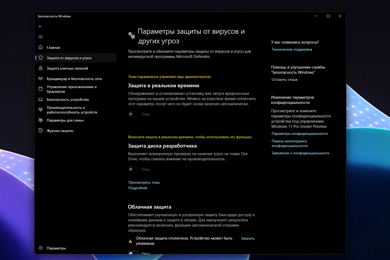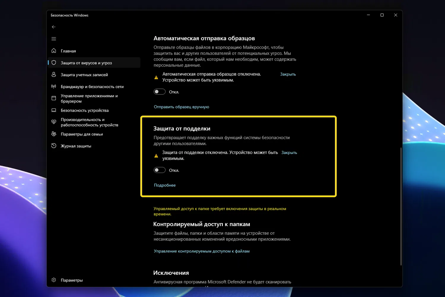 Даже если вы вручную отключите защиту Microsoft Defender, в Windows 11 она может автоматически восстанавливаться после перезагрузки. Это связано с механизмами защиты от вмешательства (Tamper Protection), службами безопасности и политиками Windows Security Health.