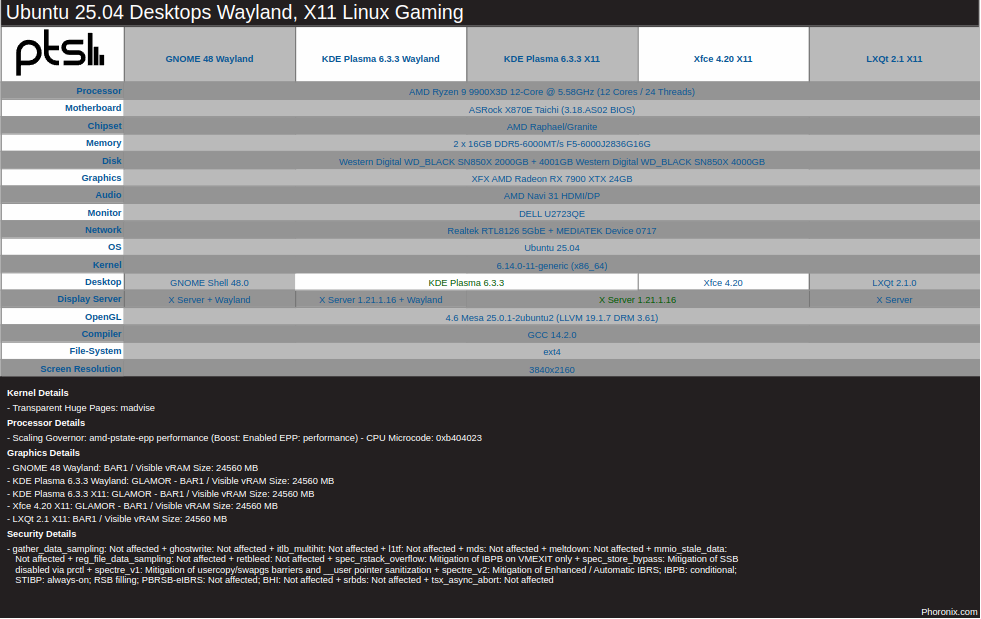 Недавно, ресурсом phoronix, были опубликованы первые результаты тестирования производительности игровых сессий GNOME 48 и KDE Plasma 6.3 на бета-версии Ubuntu 25.04. Исследование показало, что обе среды — GNOME и KDE — в режиме Wayland демонстрируют более высокую производительность по сравнению с KDE на X11. При этом GNOME на X11 не удалось запустить из-за ошибок. Некоторые пользователи задались вопросом, связано ли преимущество Wayland с тем, что разработчики GNOME и KDE перестали уделять внимание поддержке X11, или же эти среды стали слишком громоздкими. Для получения дополнительных данных проведено новое тестирование с добавлением легковесных окружений Xfce 4.20 и LXQt 2.1 на X11.
