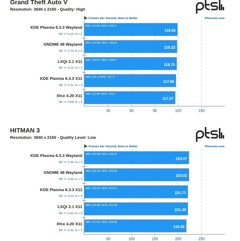 В ходе испытаний с использованием видеокарты Radeon RX 7900 XTX сессии GNOME и KDE на Wayland показали наилучшую производительность в играх сразу после установки, без дополнительной настройки. Сравнение с Xfce и LXQt выявило, что в большинстве случаев разница между окружениями была минимальной, однако ни в одном из тестов сессии на базе X11 не продемонстрировали заметного превосходства. Напротив, Wayland-сессии KDE и GNOME стабильно лидировали по показателям игровой производительности.