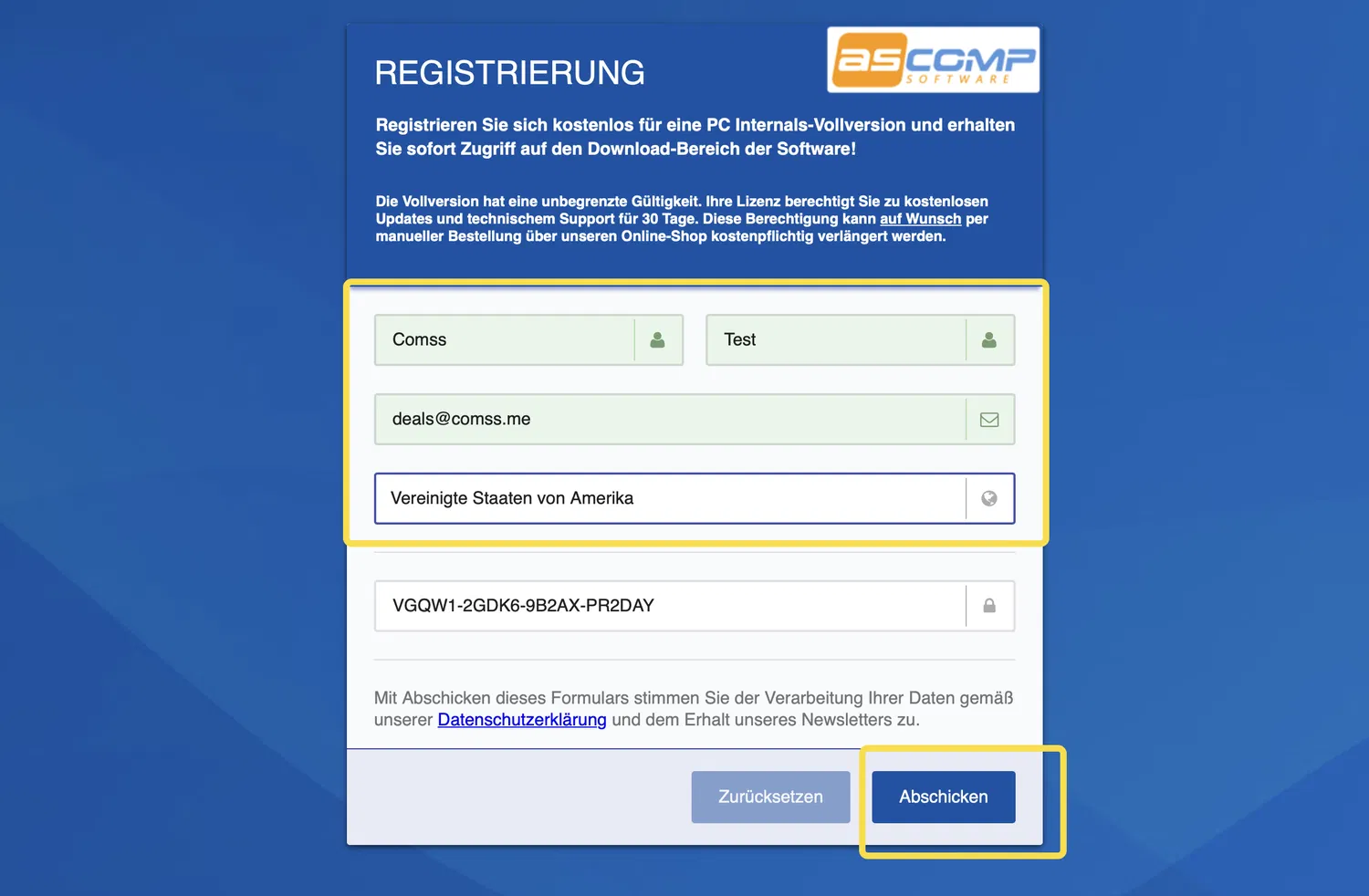- Перейдите на страницу промо-акции (на английском языке). Заполните форму вашими данными, указав действующий адрес электронной почты и нажмите Abschicken.