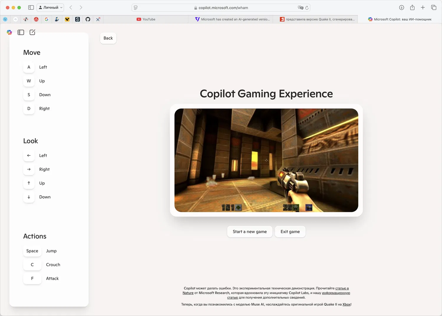 Эта техническая демонстрация является частью инициативы Microsoft Copilot для игр и включает в себя сгенерированную ИИ копию Quake II, в которую можно играть в браузере. Уровень в Quake II очень базовый, с размытыми врагами и взаимодействиями, и Microsoft ограничивает время, которое можно потратить на игру в эту демонстрацию.