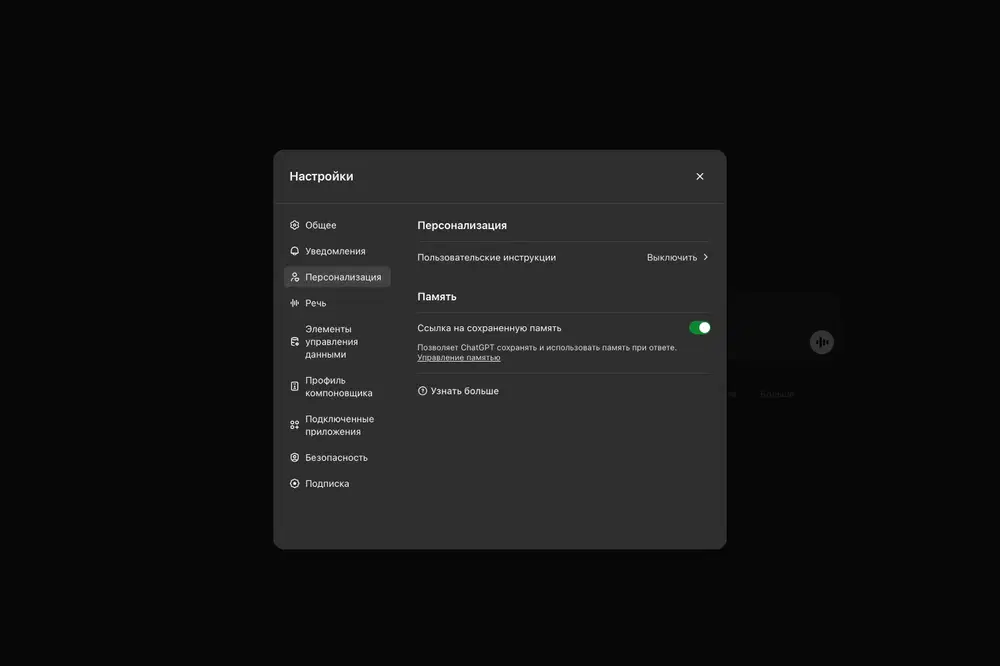 Для просмотра и управления сохранённой информацией откройте настройки профиля ChatGPT и перейдите в раздел Персонализация > Память. Здесь можно полностью отключить функцию или удалить отдельные записи.