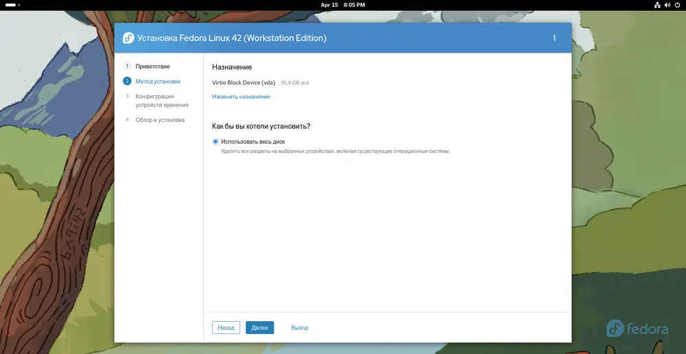Установщик Anaconda в Fedora 42 получил значительные изменения. Основное новшество — веб-интерфейс, который стал стандартным для Fedora Workstation. Он предлагает:
