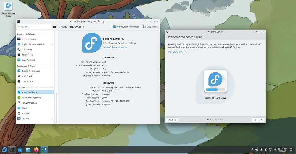 В Fedora 42 среда KDE Plasma получила статус официальной редакции наравне с GNOME. Версия Plasma 6.3.4 поставляется с Frameworks 6.13 и набором приложений KDE Gear 24.12.3. Среди новшеств: