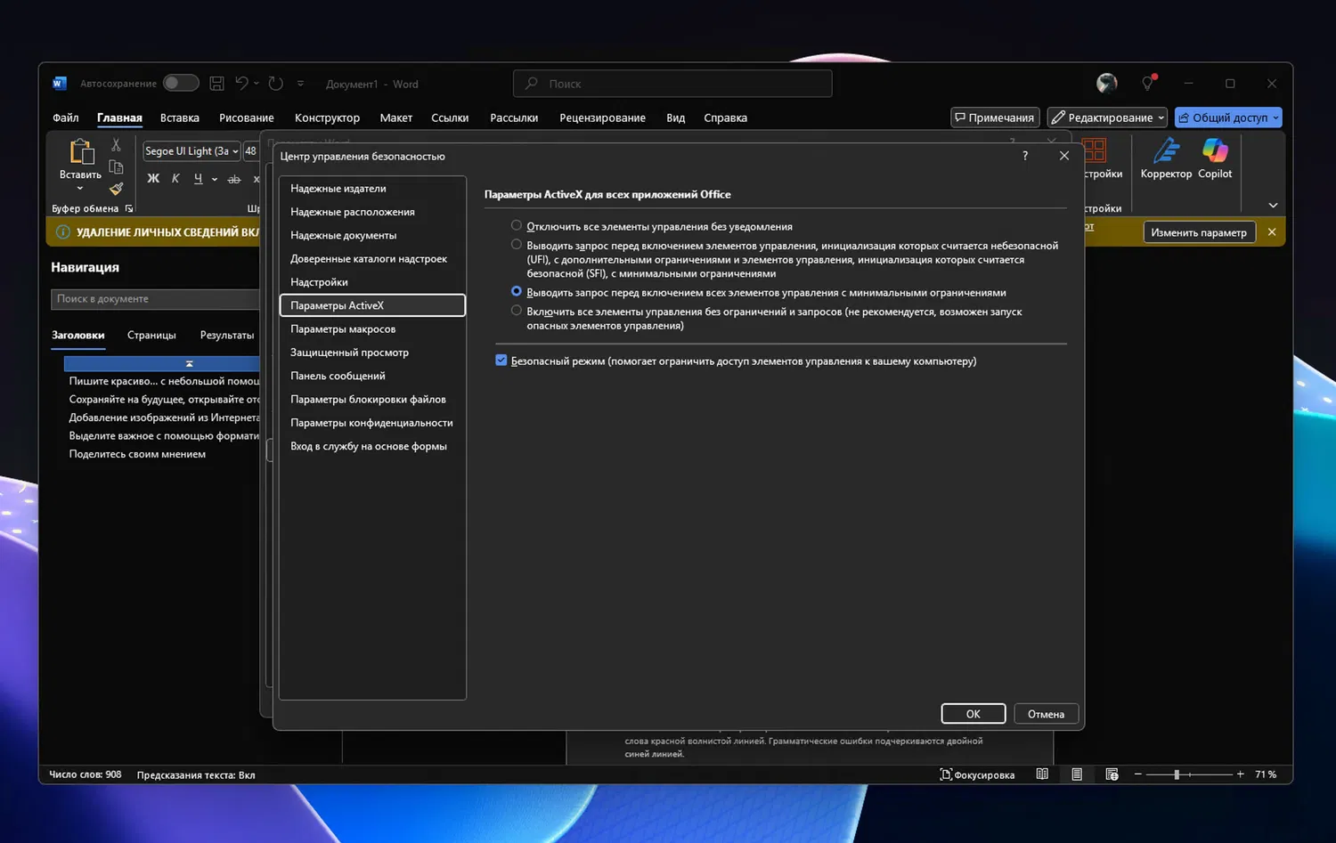 Если всё же необходимо включить поддержку ActiveX, это можно сделать через Центр управления безопасностью. Но важно понимать, что это включит ActiveX для всех приложений Office: Word, Excel, PowerPoint и Visio.