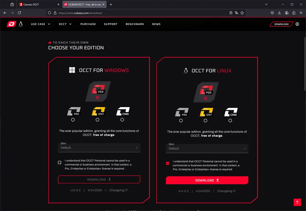 - OCCT Personal / Personal + Patreon — лицензия даёт доступ сразу к Windows- и Linux-версиям. Просто скачайте нужный дистрибутив OCCT и начинайте тестирование.