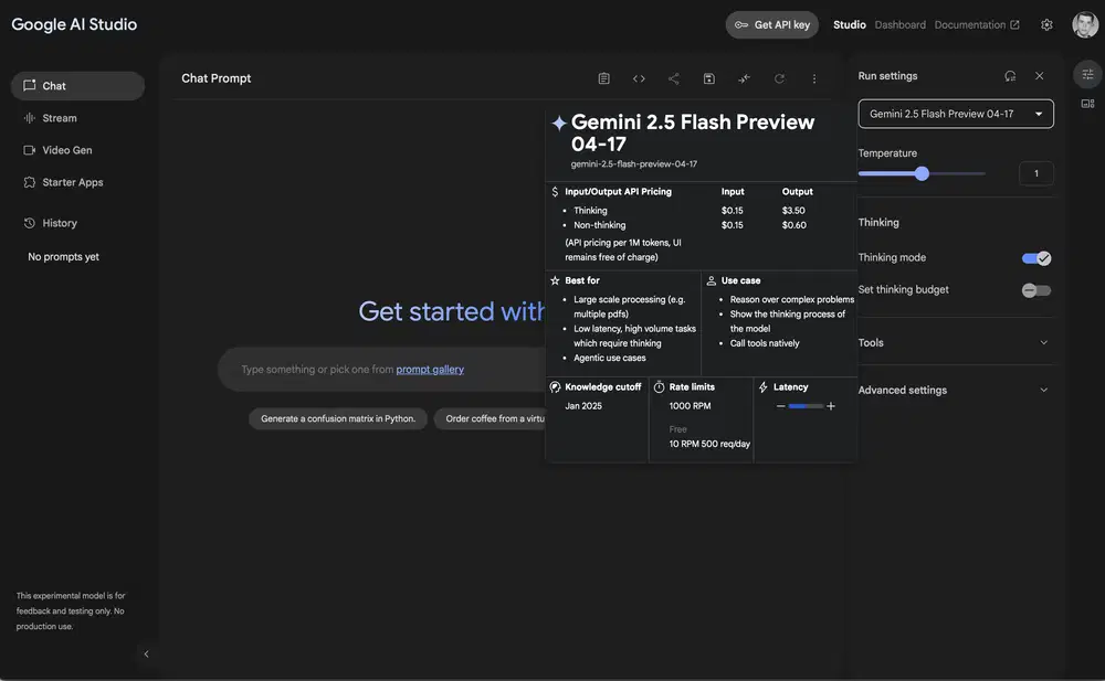 - В меню правой боковой панели выберите Model > Gemini 2.5 Flash Preview 04-17.
