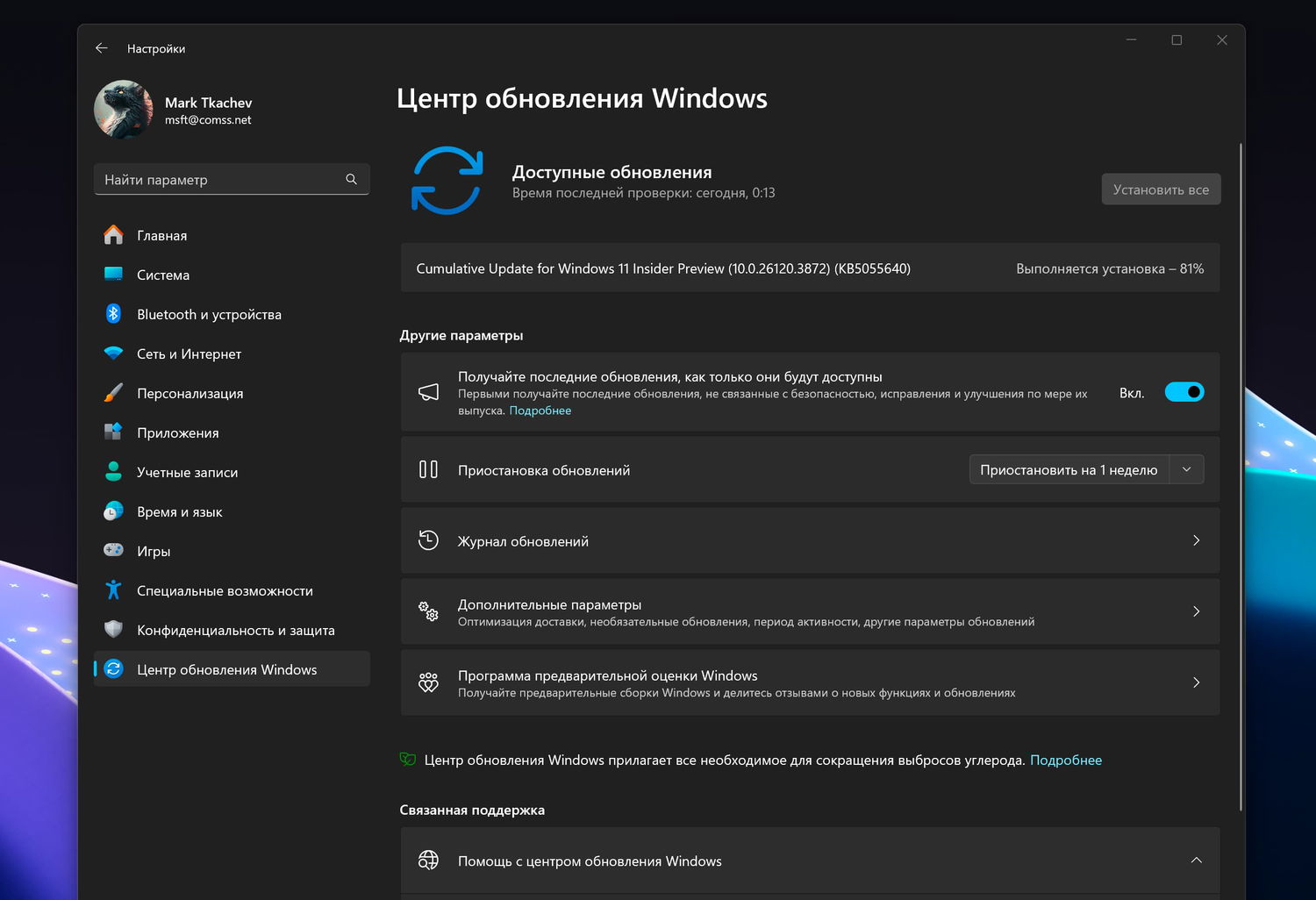 Примечание. Microsoft заблокировала установку обновлений для инсайдеров Windows 11 в России и Беларуси. Для установки обновления KB5055640 (Build 26120.3872) вы можете использовать наши DNS-серверы: Установка инсайдерских сборок Windows 11 с помощью Comss.one DNS.