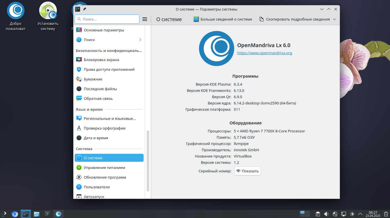 OpenMandriva Lx 6.0 базируется на ядре Linux 6.14, обеспечивающем поддержку современного оборудования и оптимизированную производительность. Основным рабочим окружением выбрано KDE Plasma 6.3, дополненное пакетами KDE Gear 25.04 и KDE Frameworks 6.13. Для пользователей, предпочитающих альтернативы, доступны сборки с GNOME 48.1, LXQt 2.2, Xfce 4.20 и экспериментальной альфа-версией COSMIC 1.0.
