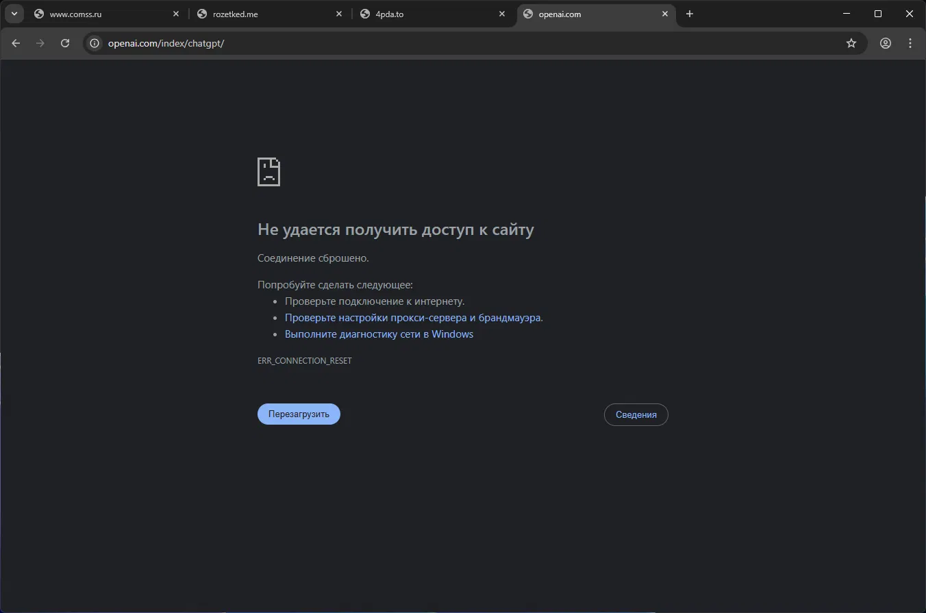 Ошибка ERR_CONNECTION_RESET возникает, когда соединение между вашим устройством и сервером принудительно сбрасывается до завершения передачи данных. Причины могут быть разными, но в текущей ситуации наиболее вероятной выглядит искусственное вмешательство в сетевой трафик.
