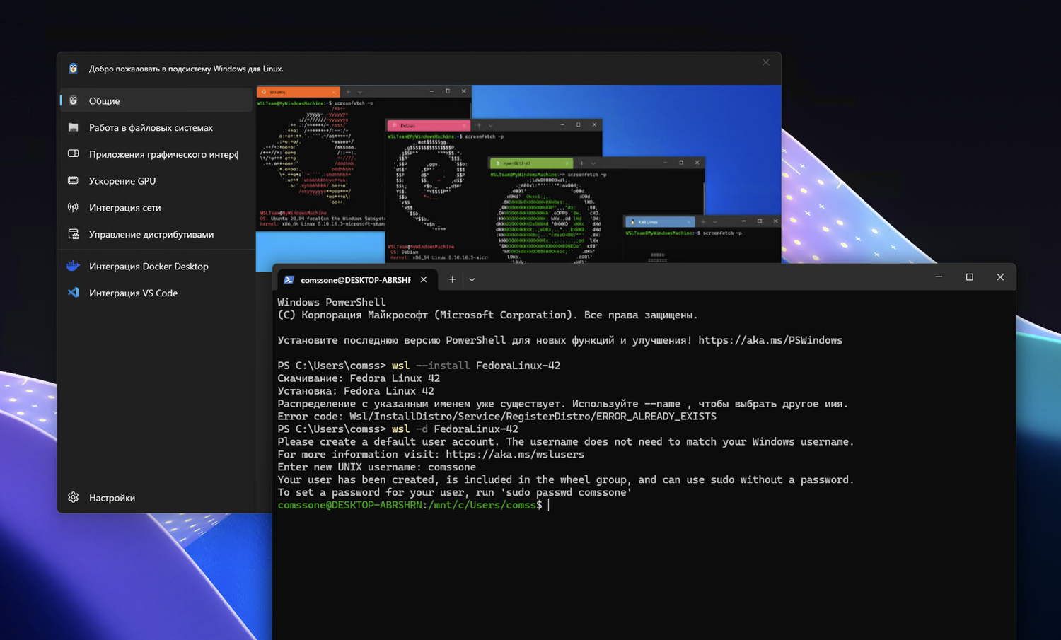 Для установки Fedora Linux в WSL выполните следующие команды: