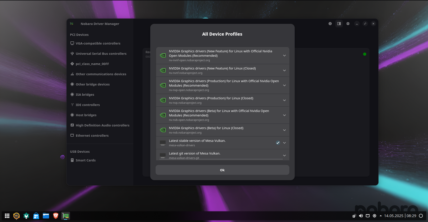 Nobara 42 обновила интерфейс менеджера драйверов, упрощая переключение между стандартными и Git-версиями Vulkan-стека Mesa, а также между стабильными, бета- и экспериментальными ветками NVIDIA. Это позволяет пользователям настраивать систему без использования терминала. Mesa 25.1 включает дополнительные патчи для поддержки Wine Wayland и недавно анонсированной игры DOOM: The Dark Ages от id Software.