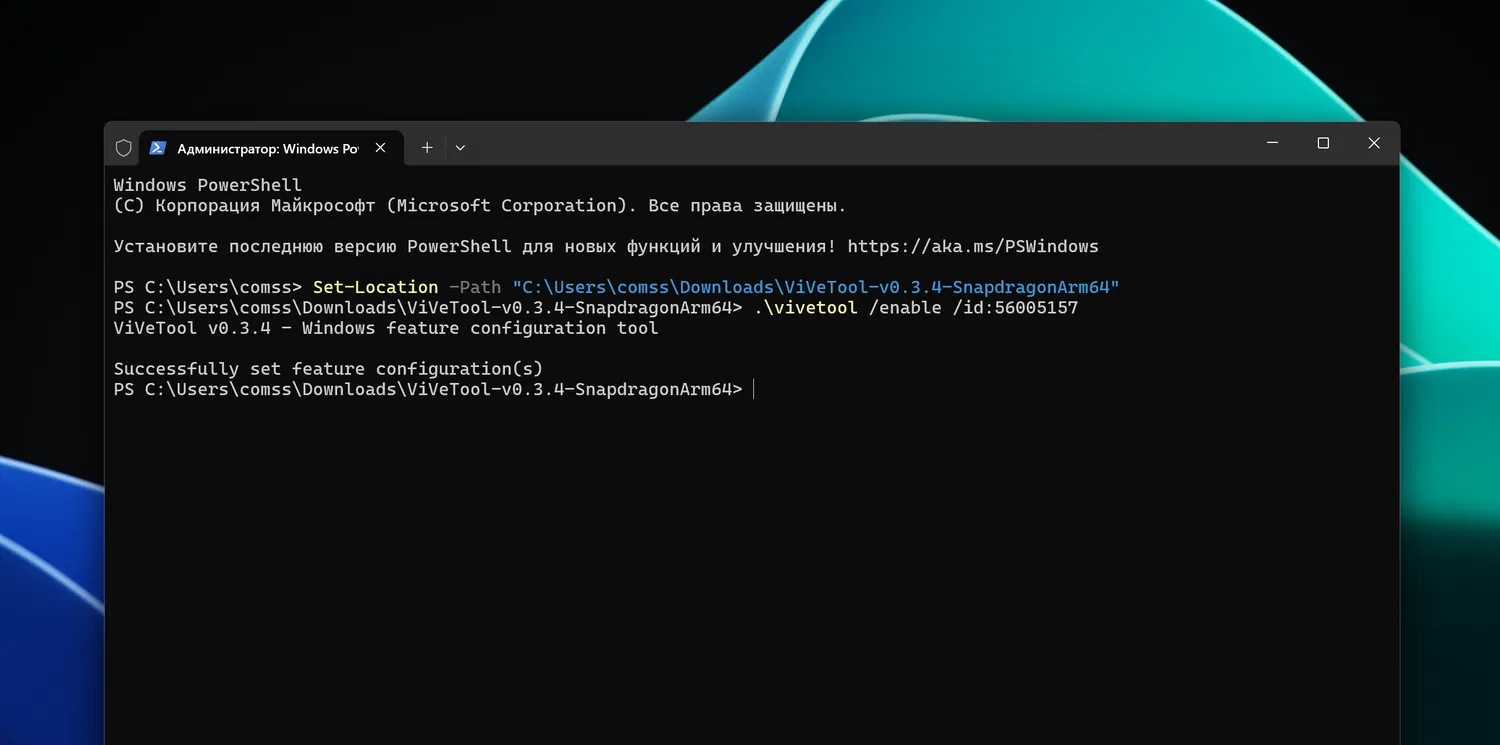 Примечание: В примерах используются команды в Терминале для профиля PowerShell. Если вы используете профиль Командная строка, замените начальную команду .\vivetool на vivetool.
