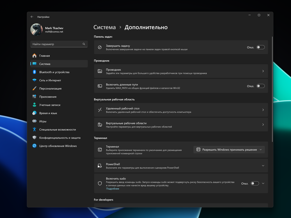 Новая страница «Дополнительно» — это переработанный раздел «Для разработчиков» (Параметры > Система). На данной странице можно настроить различные параметры, которые будут полезны не только разработчикам и энтузиастам, но и обычным пользователям. Обновленная версия включает больше функций, часть из которых ранее была доступна в закрытом приложении Dev Home. Кроме того, улучшилась структура страницы — навигация стала проще и понятнее.