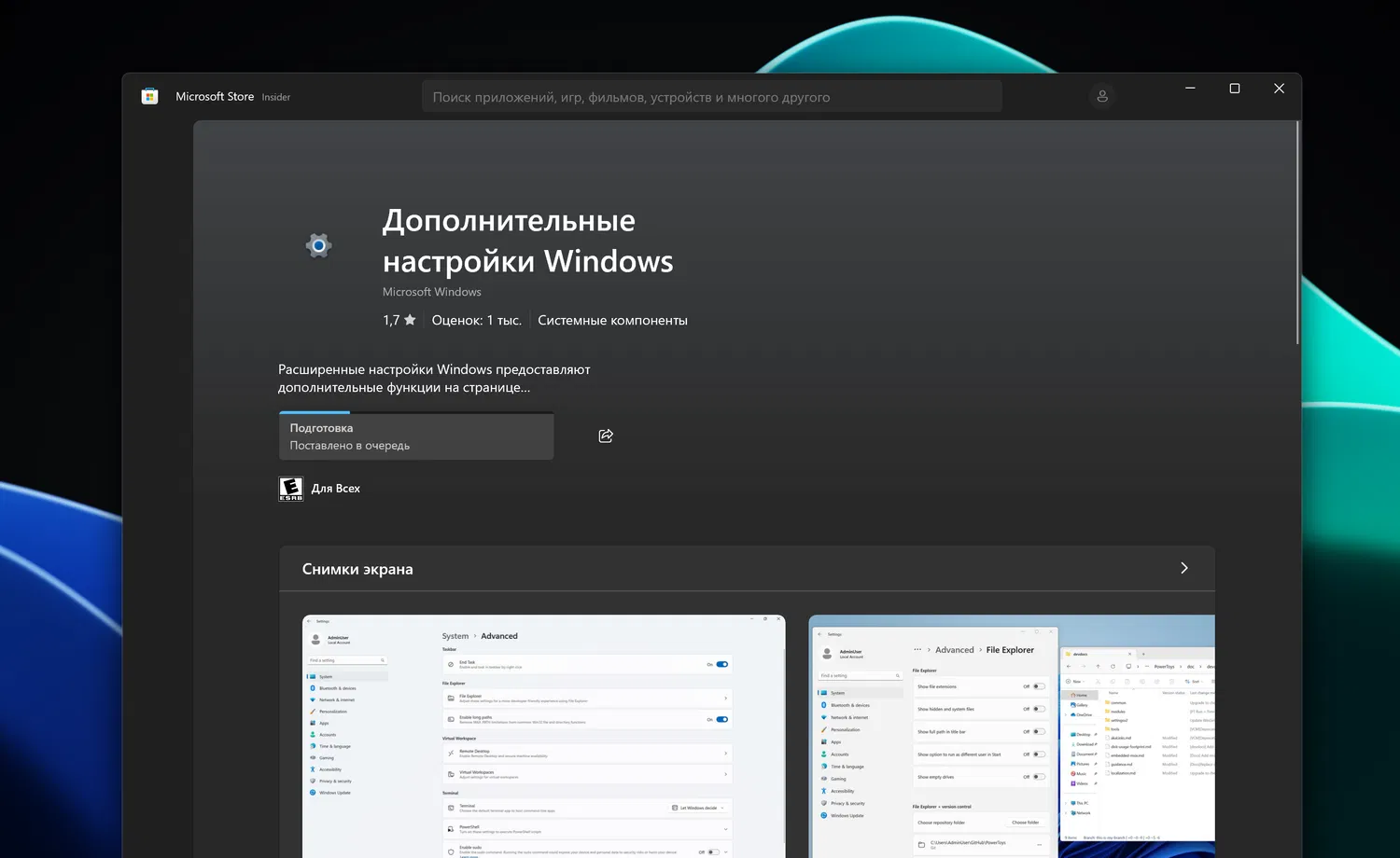 Microsoft пока официально не анонсировала этот раздел, но его уже можно активировать в последних предварительных сборках Windows 11 из каналов Dev и Beta. Он распространяется через обновление из Microsoft Store: откройте раздел «Скачивания», проверьте наличие обновлений — и увидите компонент «Дополнительные настройки Windows».