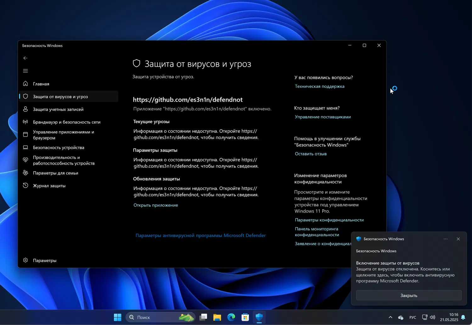 На данный момент Microsoft Defender распознает и помещает Defendnot в карантин как угрозу Win32/Sabsik.FL.!ml.