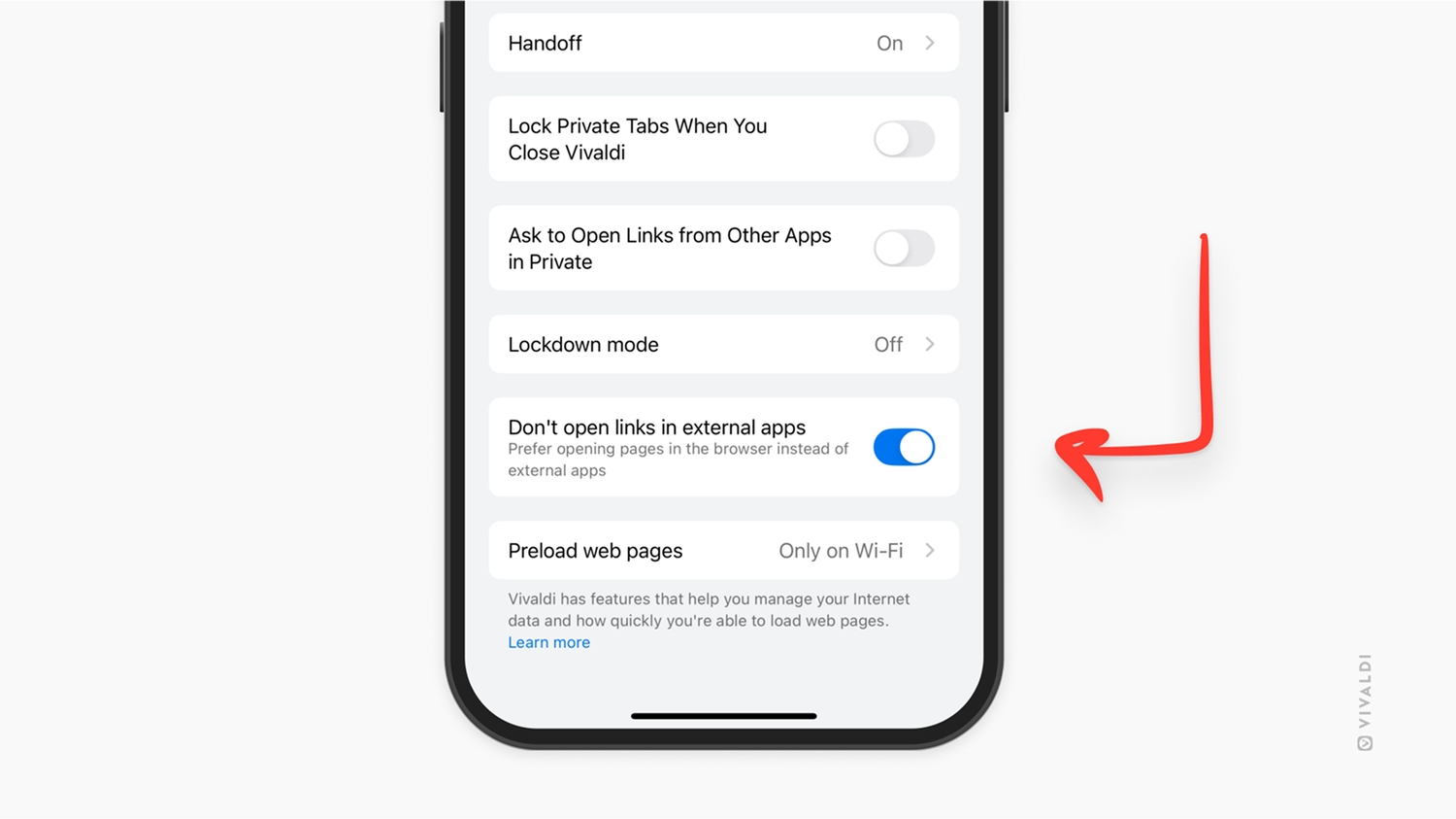 Добавлена опция, позволяющая запретить автоматический переход из браузера в сторонние приложения по внешним ссылкам. Это уменьшает количество переключений между приложениями и сохраняет пользователя в текущей сессии Vivaldi.