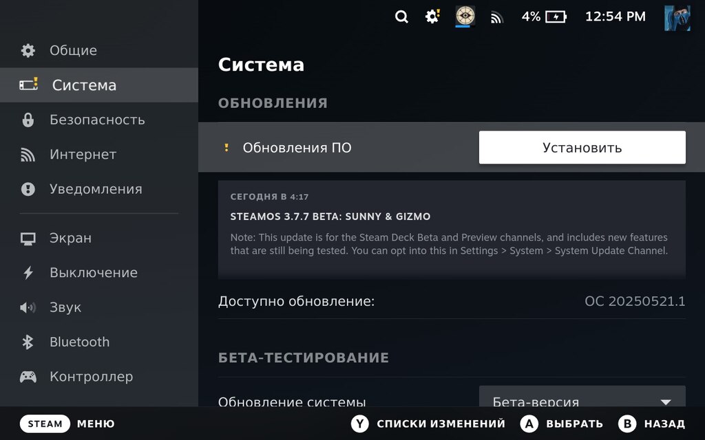 SteamOS 3.7.7 Beta доступна на каналах Beta (Бета-версия) или Preview (Ранняя сборка). Чтобы получить обновление, перейдите в Настройки > Система > Бета-тестирование и выберите один из этих вариантов.
