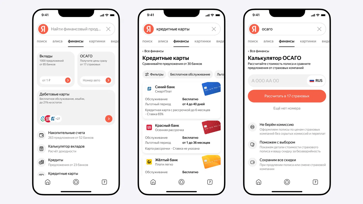 Вертикаль «Финансы» помогает сравнивать и подбирать банковские и страховые продукты: от вкладов и дебетовых карт до ипотеки и полисов ОСАГО. Пользователи могут применять фильтры для поиска — например, указать желаемый льготный период по карте, вид рассрочки или частоту начисления процентов по накопительному счёту.