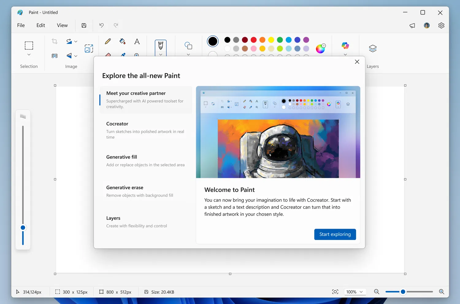 - Новый приветственный экран — позволяет быстро ознакомиться с последними функциями Paint. Его можно закрыть в любой момент и открыть снова, кликнув на иконку мегафона в правом верхнем углу.