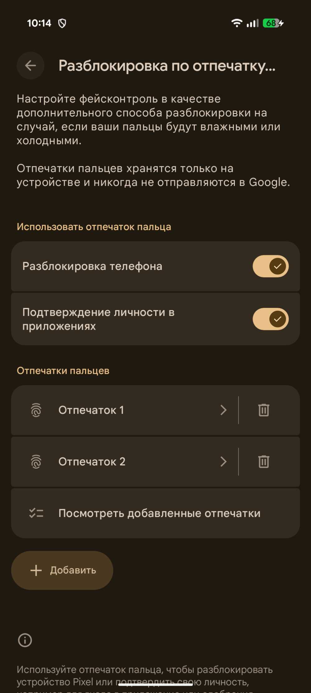 В разделе настроек для разблокировки по отпечатку появилась новая функция «Проверка зарегистрированных отпечатков». При нажатии открывается чёрный экран с символом отпечатка. После касания экран возвращает пользователя в меню настроек, показывая, какой отпечаток был использован. Если отпечаток не зарегистрирован, появляется сообщение «Отпечаток не распознан». Это полезная функция для проверки безопасности устройства.